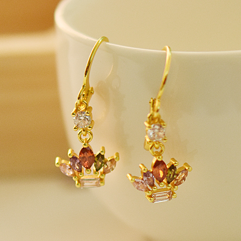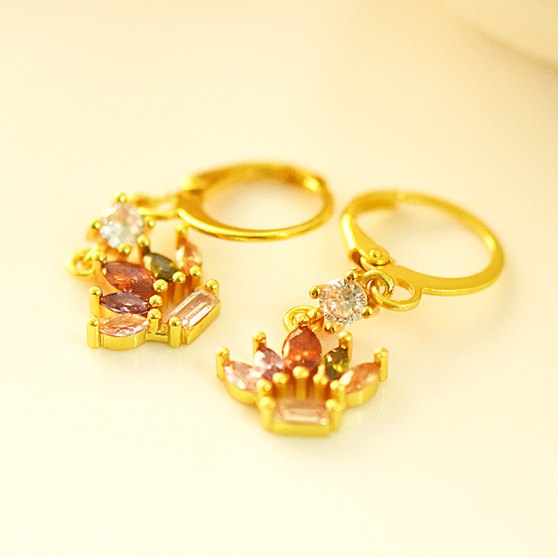 Elegant 18k gold-plated crown earrings with colored gemstones. European and American style copper earrings perfect for special occasions and gifts. Luxurious design.